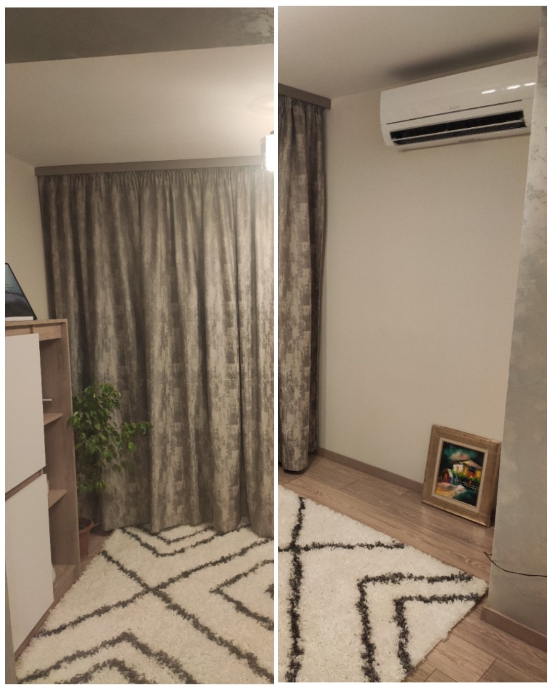 Диванът е със светлокафява дамаска и тъмнокафеви дървени подлакътници, а мебелите са бяло+дъб арвен, светлосиви стени.
