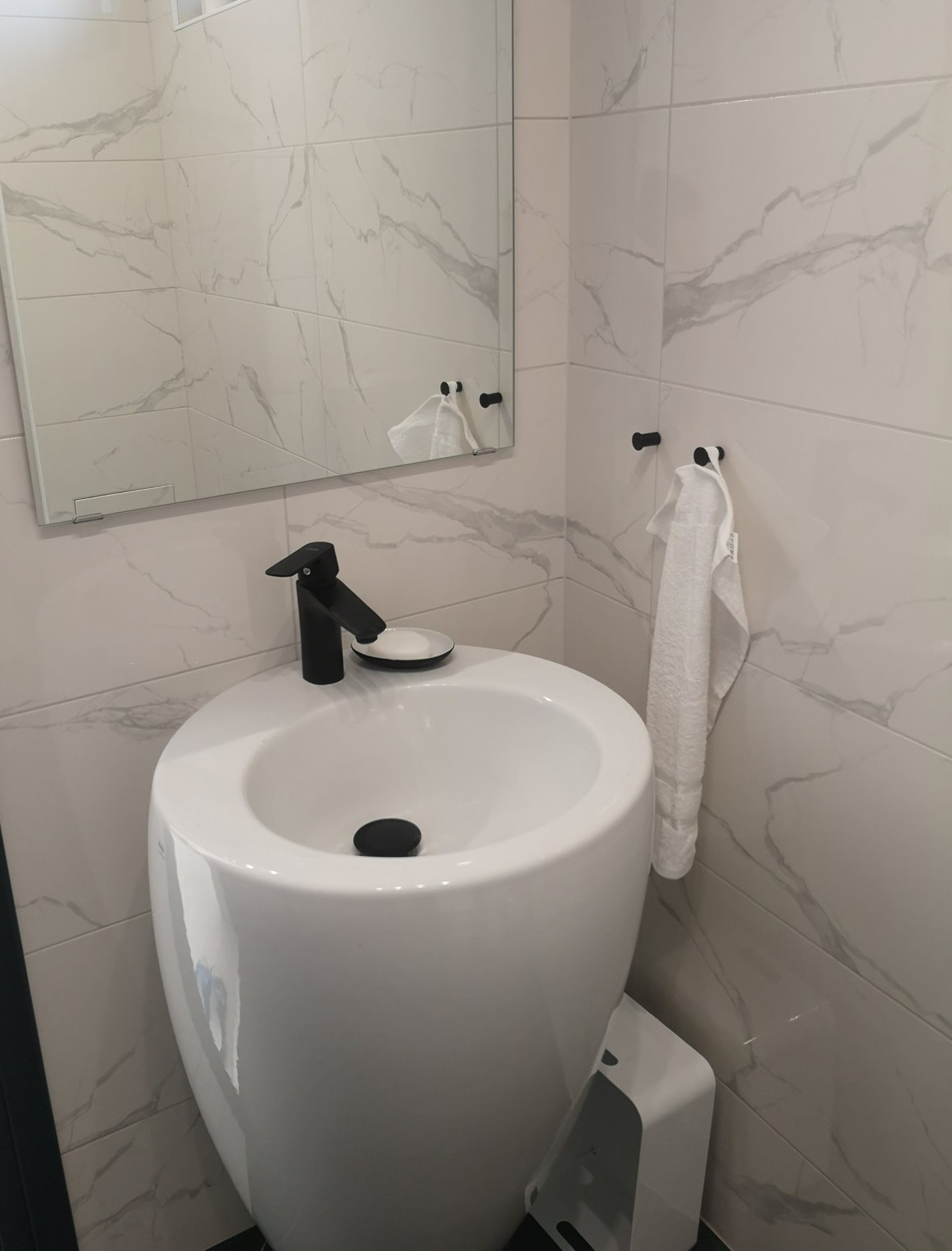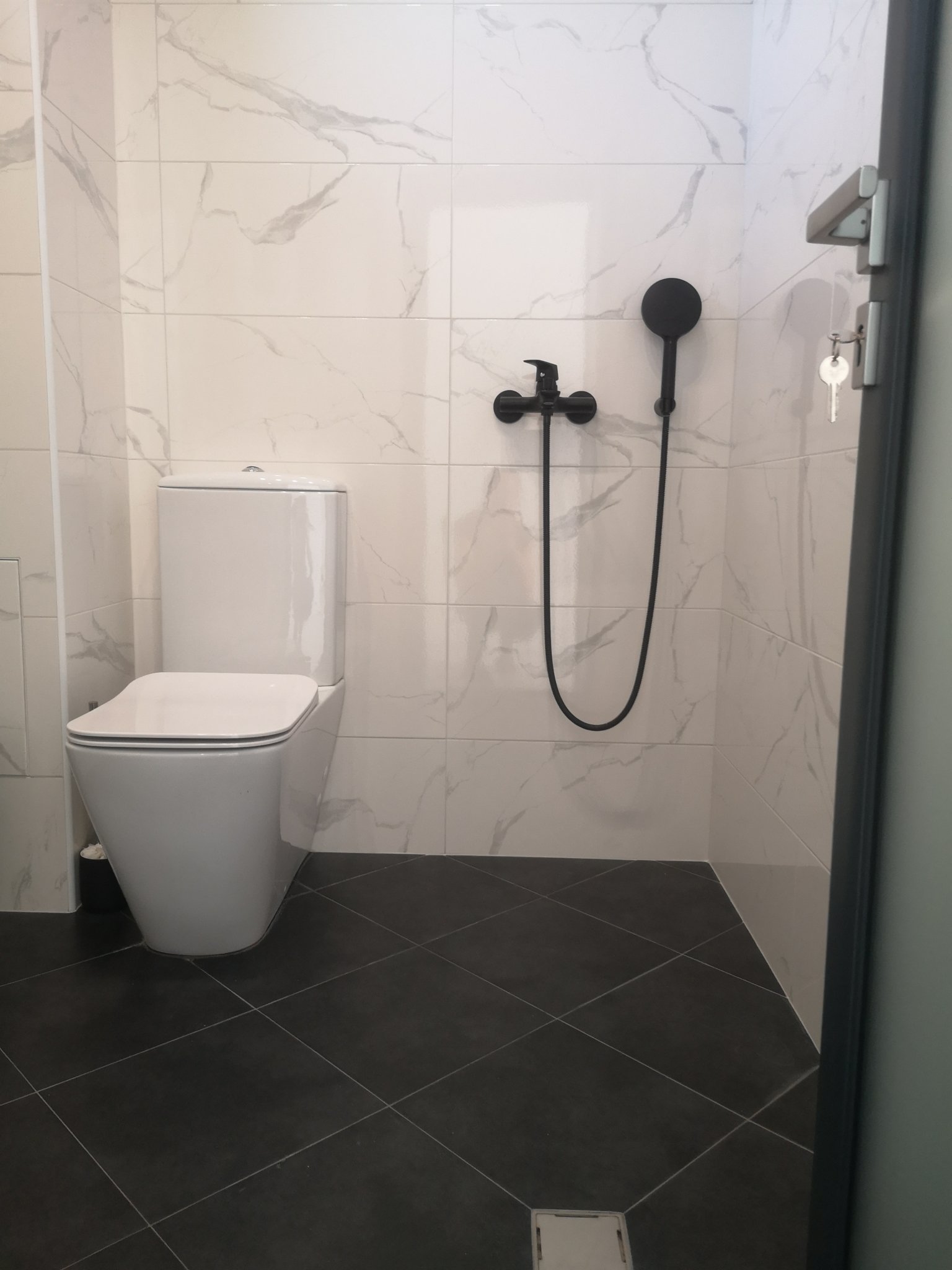 Черни кърпи/ше има в Икеа и Метро.Много хубава е станала банята.Има ли място за параван между душа и тоалетната?( само информативно питам, рсзбрах, че няма да се ползва като баня в момента)