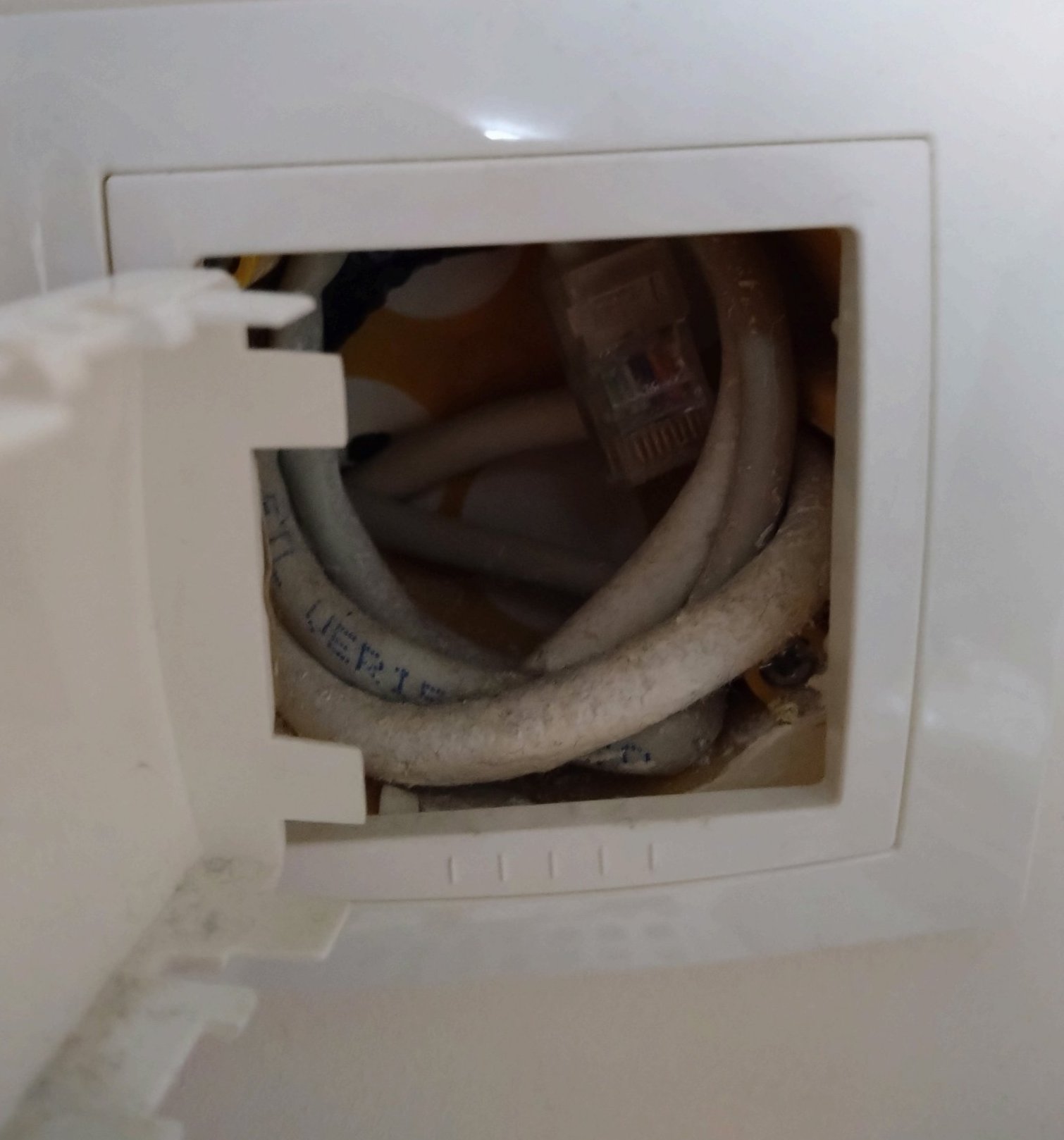 Двойна ел.кутия в едната е ел.контакт, в другата  коаксиален кабел (и мрежа). Към ел.контакта е закрепена двойната рамка, а свободното място е скрито с клавиш за ключ за осветление (държи се с двойно залепяща се лента за рамката). Решихме да не поставяме контакт за мрежа+ТВ, защото ако се включат към него кабели ще стърчи много напред ТВто. Дължината на намотаните кабели в кутията биха били колкото да се включат в ТВ.