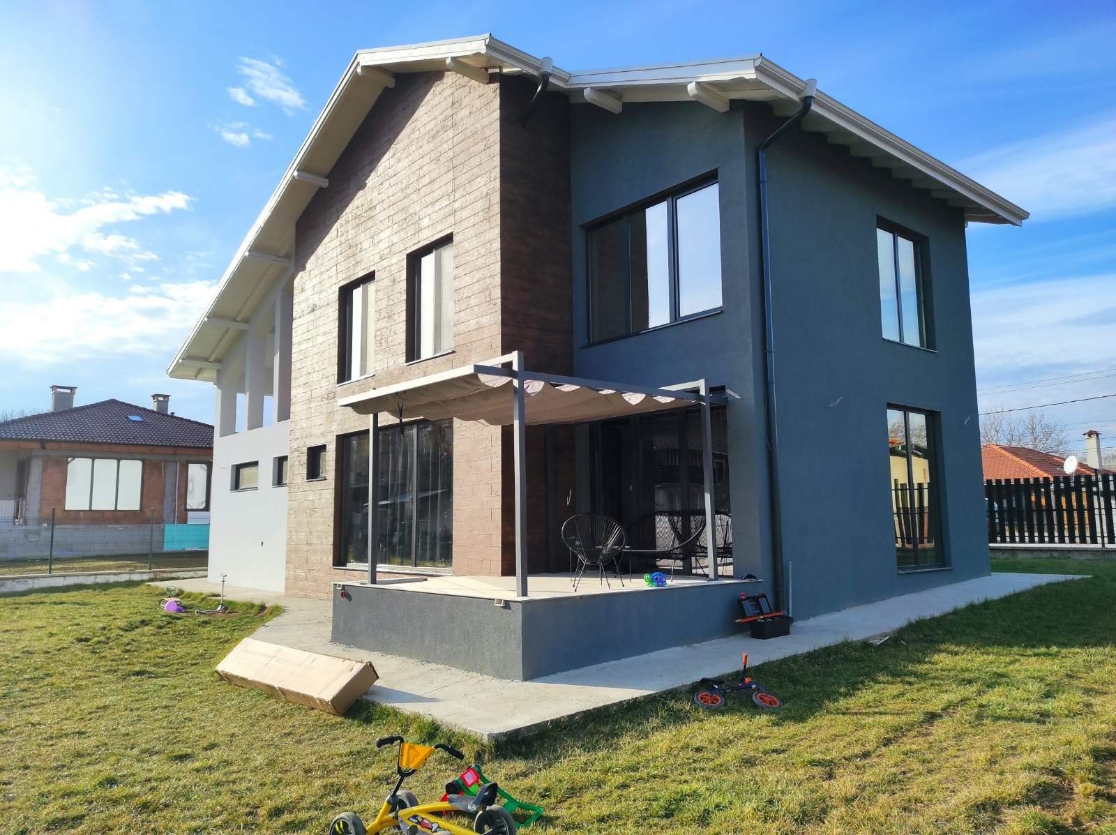 Много е красива перголата! Heart Eyes Супер се съчетава с облицовката на къщата.