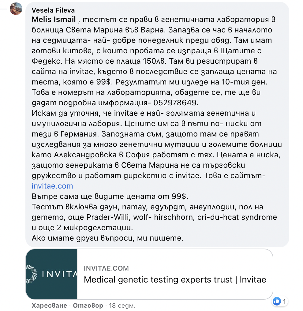 Правят пренатест, който изпращат в Америка, казва се Invitae. Aз вчера звънях за инфо и в понеделник смятам да отида. Прикачвам картинка с повече информация, която аз открих и звъннах на посочения телефон.