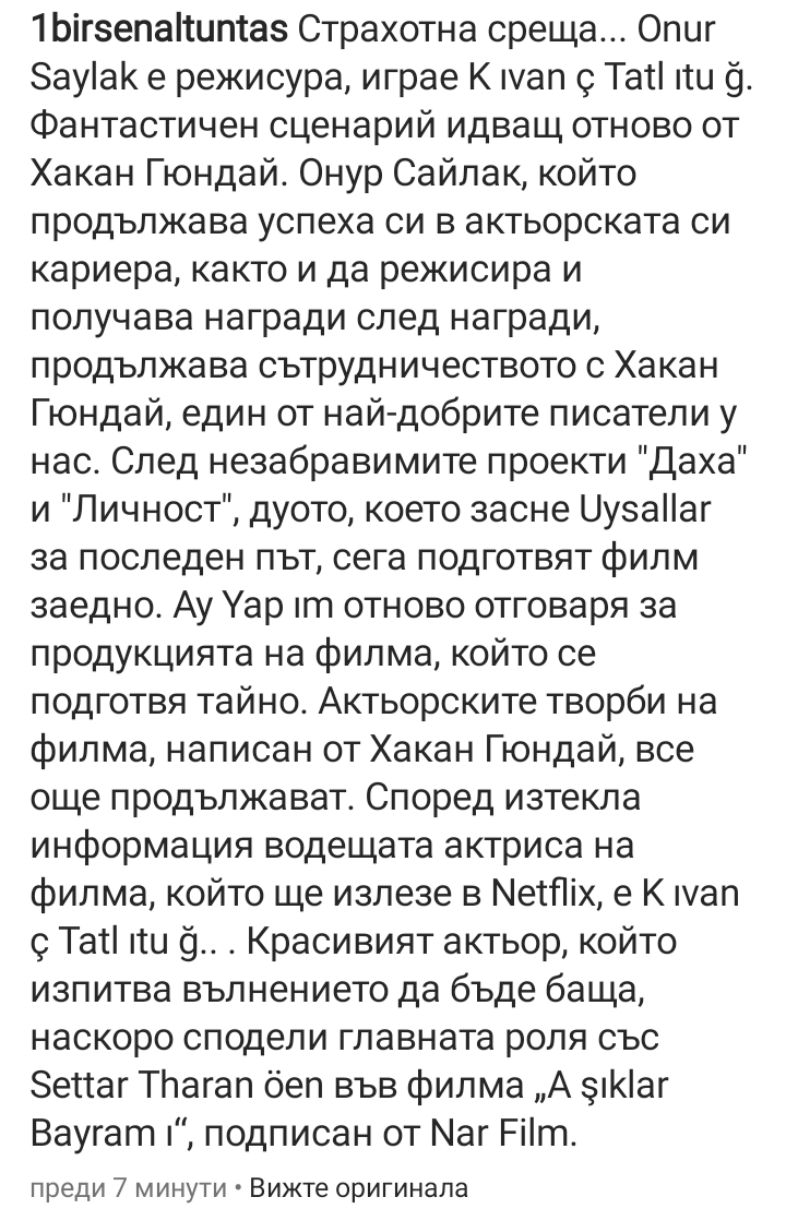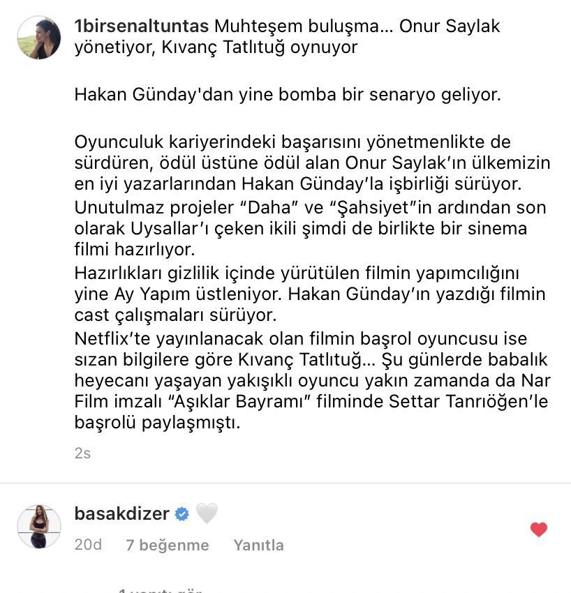 Е, поне работи, а той каза, че иска да снима филми и това прави. Да му мислим ние ... Дано имат голям успех и двата, предполагам, че ще си заслужават, той внимателно си подбира историите. Ако Бирсен е права, а явно е, щом и Башак е реагирала по този начин, ами чудесно, журналист все още не е играл. Колкото и да ни се иска да си го гледаме всяка седмица, мисля, че скоро на тв - то май ще останат да играят само по-младите, все още недоказали се актьори, а ако тв не променят системата си и те няма да искат да играят там. Цифровите платформи действително взеха да настъпват в Турция .