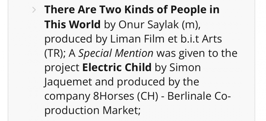 Фестивалът Берлинаре, за който се говори в интервюто с Онур, ще се проведе следващата седмица, а в одобрените за 2020 по проекта от наградния фонд филми, има следната информация: