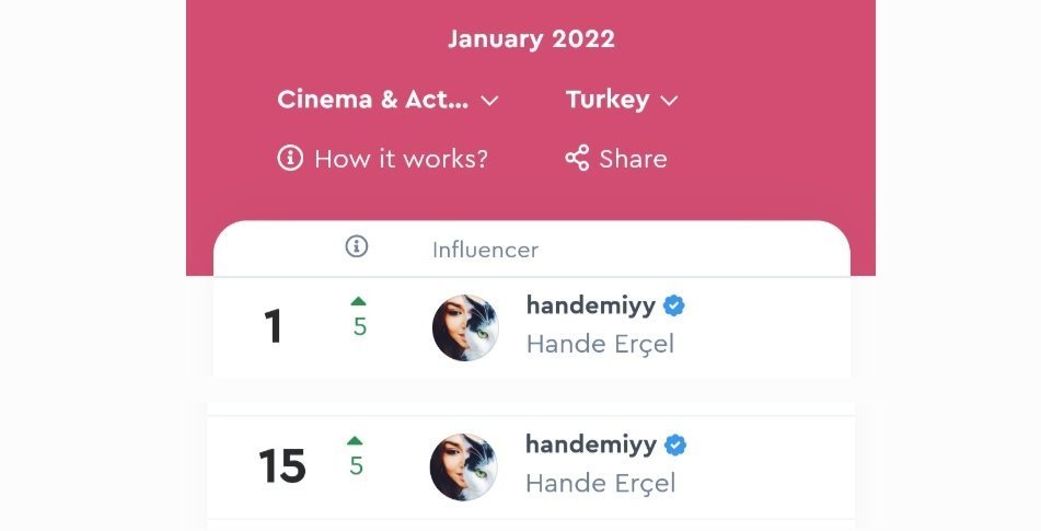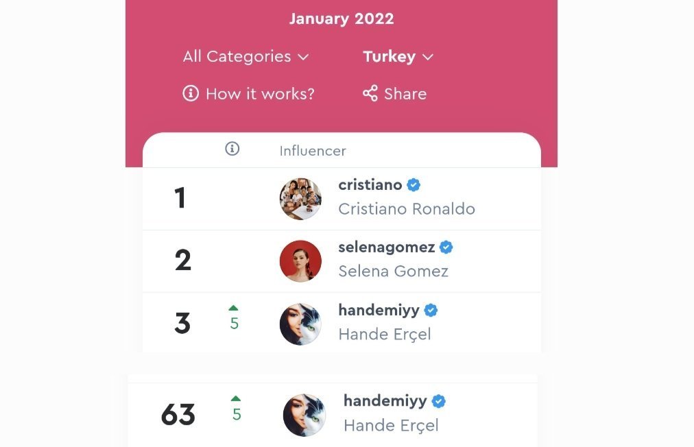 HypeAuditor'ın son instagram verilerine göre #HandeErçel Sinema & Aktör - Aktris kategorisinde Türkiye'de 1, dünyada 15. sırada. Tüm kategorilerde Türkiye'de 3, dünyada 63. sırada