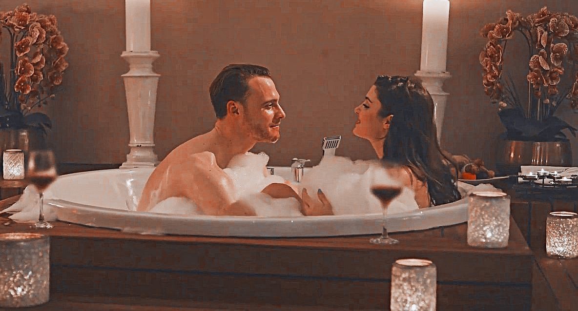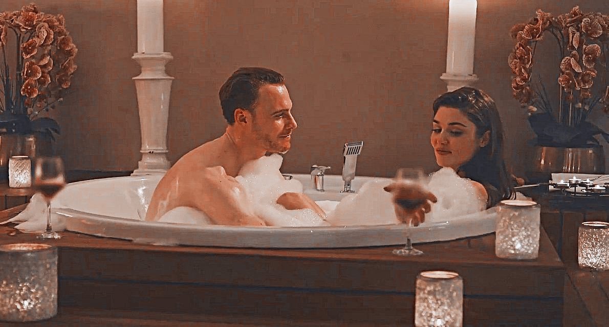 А за настроение вижте тези щастливи лица. Преплели крака в тясното джакузи, с блеснали от любов очи. Как ли са се чувствали докато са снимали тези сцени? Няма нужда от отговор, той е изписан на лицата им...