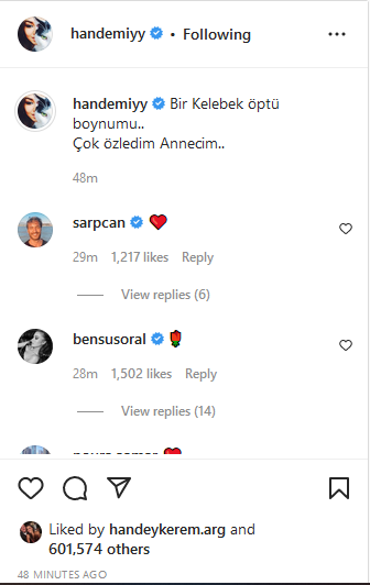 Майката на Керем с коментар на поста на Ханде  от вчера за годишнината на майка й Heartbeat
