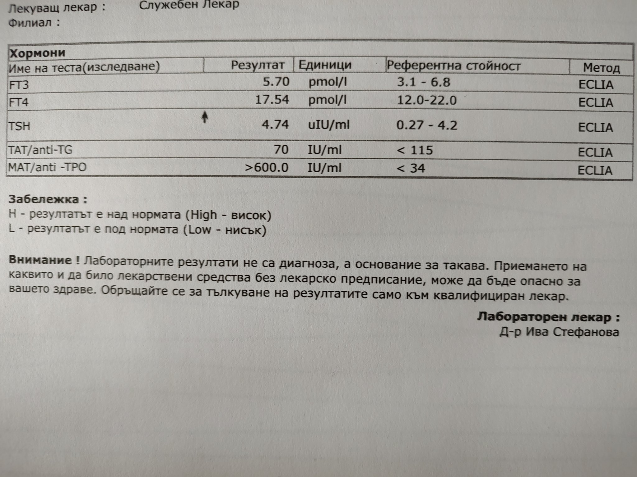 Резултатите от изследванията на щитовидната жлеза показват ниски нива на FT4, което предполага хипофункция и може да изисква лечение със синтетичен хормон. Освен това е открит единичен възел в левия лоб, придружен от дифузни промени в тиреоидния паренхим, което може да е показателно за Хашимото. Анти-ТПО антителата са се повишили почти двойно от предишното изследване, което предполага потенциален проблем. Може да се наложи пускане на туморен маркер, биопсия или операция в зависимост от препоръката на лекар. От съществено значение е да потърсите медицинска помощ за подходящо лечение и управление на състоянието.