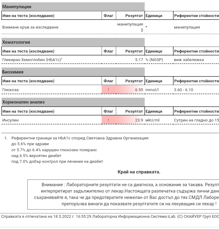 Това е инсулинова резистентност според тези резултати. Дори според официалната медицина е лечимо. Започвай незабавно спорт и диета, има и тема за ИР. Хапчетата само замазват нещата и отлагат диабета, ако ще се осланяш само на тях. Попитай момичетата в темата, които са пробвали какво ли не. Добре си, навреме го хващаш, можеше да е много по-зле.