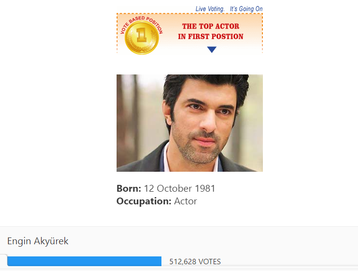 Още един сайт, на който усилията ни (редовното гласуване) изпратиха Енгин Акюрек там, където му е мястото - номер 1 сред турските актьори: