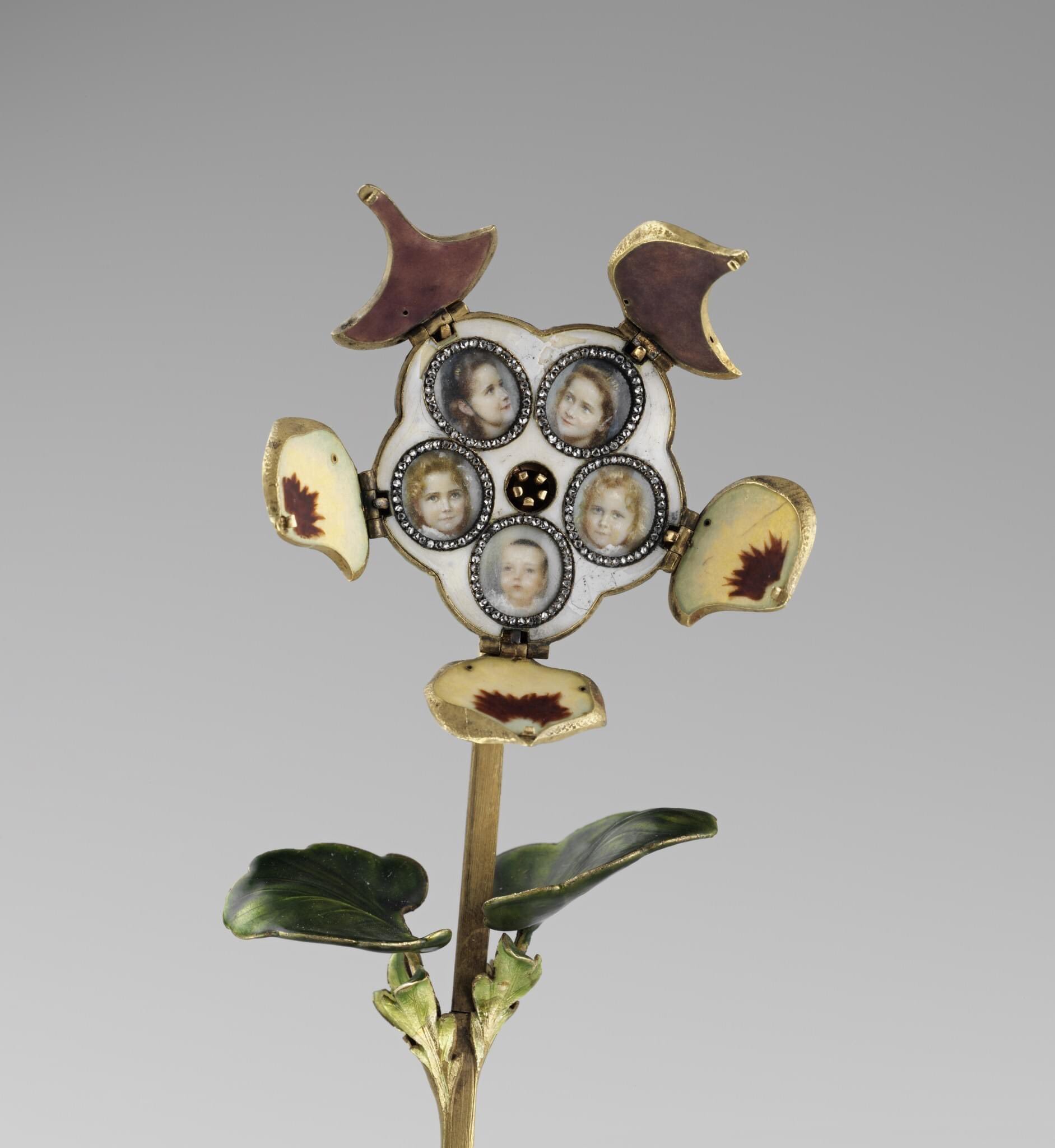 Вазата от скален кристал е гравирана с римската цифра „X“ и венчелистчетата се разгръщат, за да разкрият портретни миниатюри на техните пет деца.