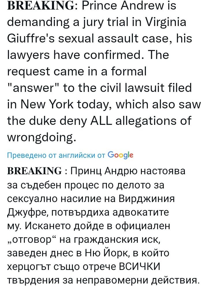 Андрю настоява за съдебен процес с жури по делото на Вирджиния, в Ню Йорк: