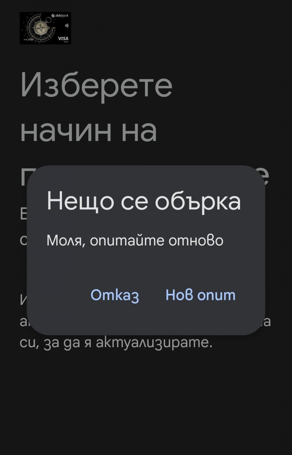 GPay не иска да регистрира виртуалната ми карта. Т.е. фигурира там, но не мога да се разплащам през Google Wallet с нея.