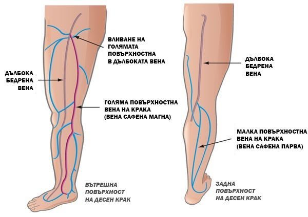 Където е проблема, но по принцип минават по вътрешната страна на краката от глезените до ингвиналните гънки. Обикновено проблемна е вена сафена, но и дълбоките вени също.