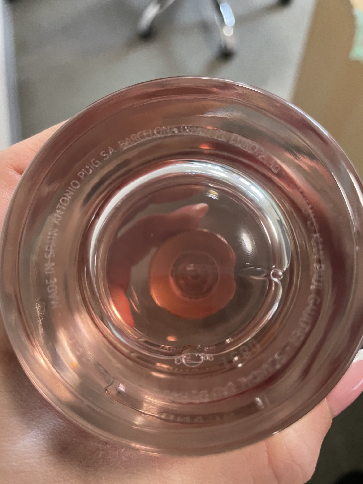 Нямаше опаковка на кутията - целофан или друго. EDP - то е 80 мл., нямаше празен ход, а и няма нищо на дъното - нито гравирано, нито етикет, последното не знам дали не трябва така да бъде, никога не съм имала този парфюм, за да сравня. За липсващото количество нищо не казвам, защото другите ми JPG никога не са пълни, но винаги са били с празен ход.