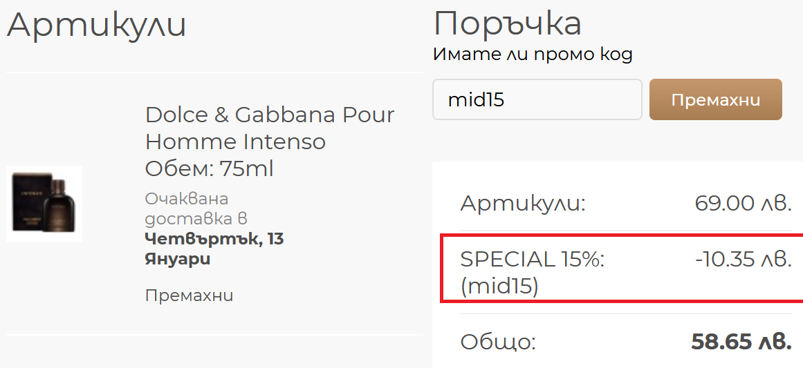 Здравейте. Някой има ли активен код за отстъпка в някой от Бг сайтовете. Искам да взема  D&G Intenso , не държа да е продукт ,може и тестер. Благодаря.