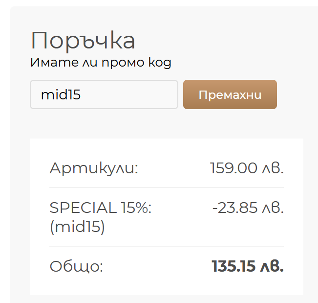 Супер . Много благодаря. На 125 мл приспада 15 %, но на 200 мл не иска да го добави в кошницата и там да напиша промокода. Дали защото пише, че остава 1 бр. Или нещо проблем при мене има