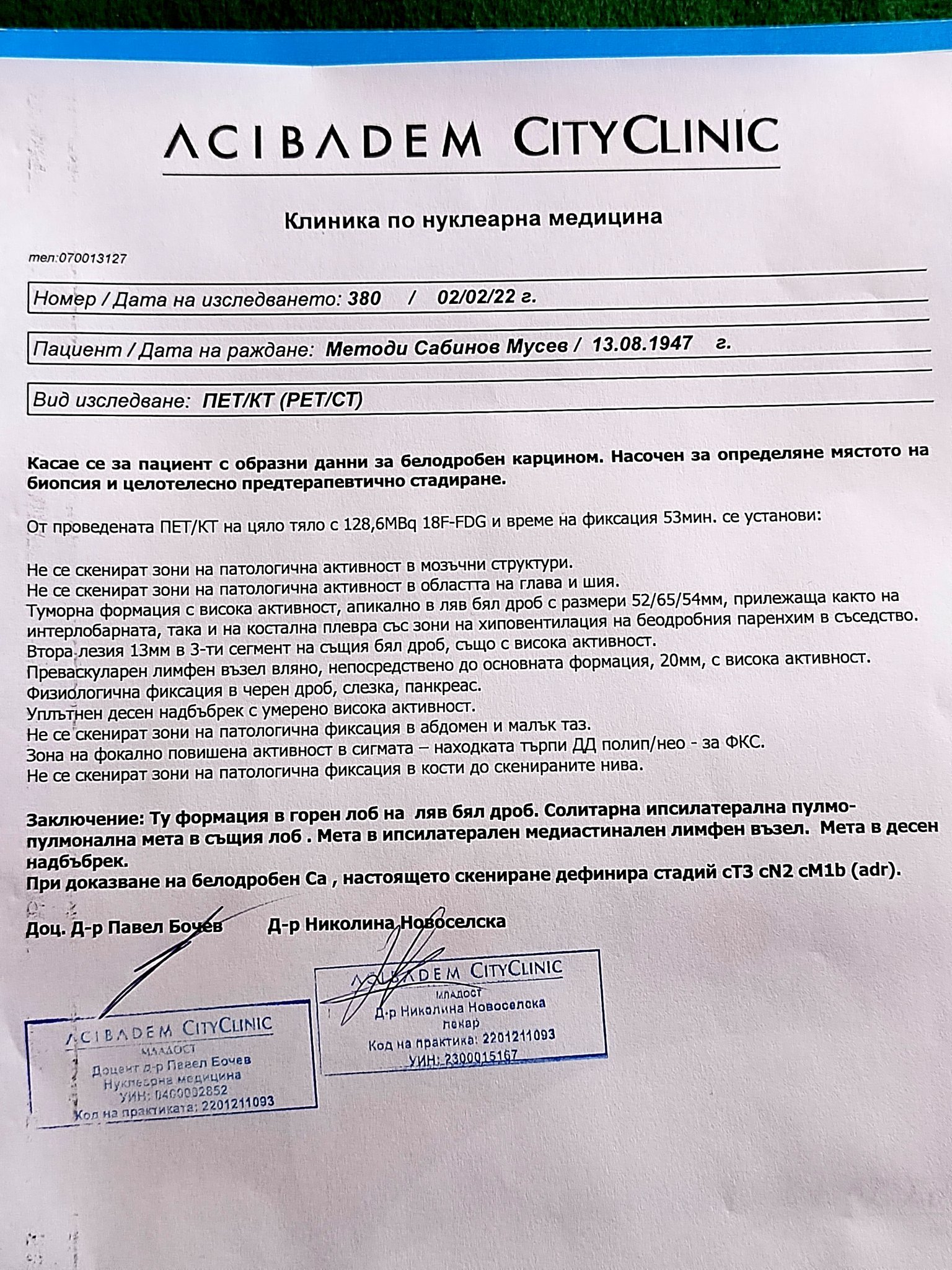 Здравейте, мили приятели спешно се нуждая от консултация с онколог в сферата на пулмологията, става въпрос за метастазирал карцином на бял дроб, дилемата ни е да изберем възможно най-скоро специалист който да даде мнение за лечението на баща ми, благодаря на всички озовали се!