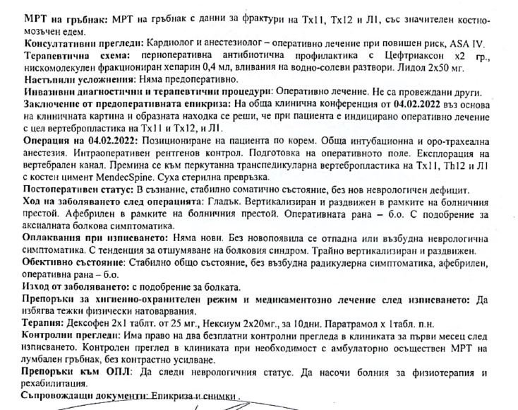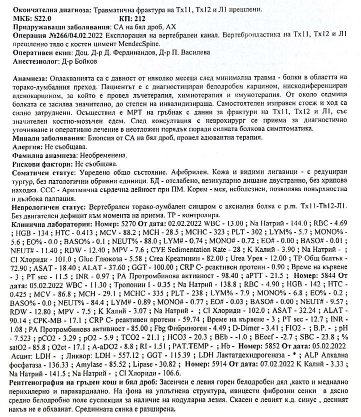 здравейте, и аз да се включа с последната епикриза на баща ми. От появилата се остеопороза (в скенера пише, че е по вероятност от ЛТ) и фрактура на 3 прешлена, му беше направена вертебопластика на тях ("циментиране") в болница Св.Иван Рилски в София, с пълна упойка.  (ако на някой му трябват подробности за операцията/интервенцията - мога да дам на лични или тук, при нужда). Уж говорихме да вземели биопсия да се изследва дали е метастаза, но не са го направили, защото според тях е било остеопороза, а не в следствие на метастаза. Вече си е вкъщи и се надявам да се да се стабилизира повече и да може да се движи, а не само болка непрекъснато да изпитва (както казват д-рите - да му се подобри качеството на живота) и да си продължи ИТ. Ето я и самата епикриза: