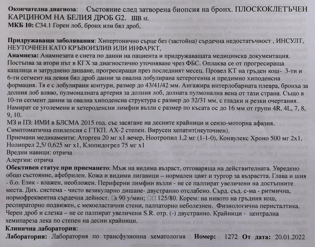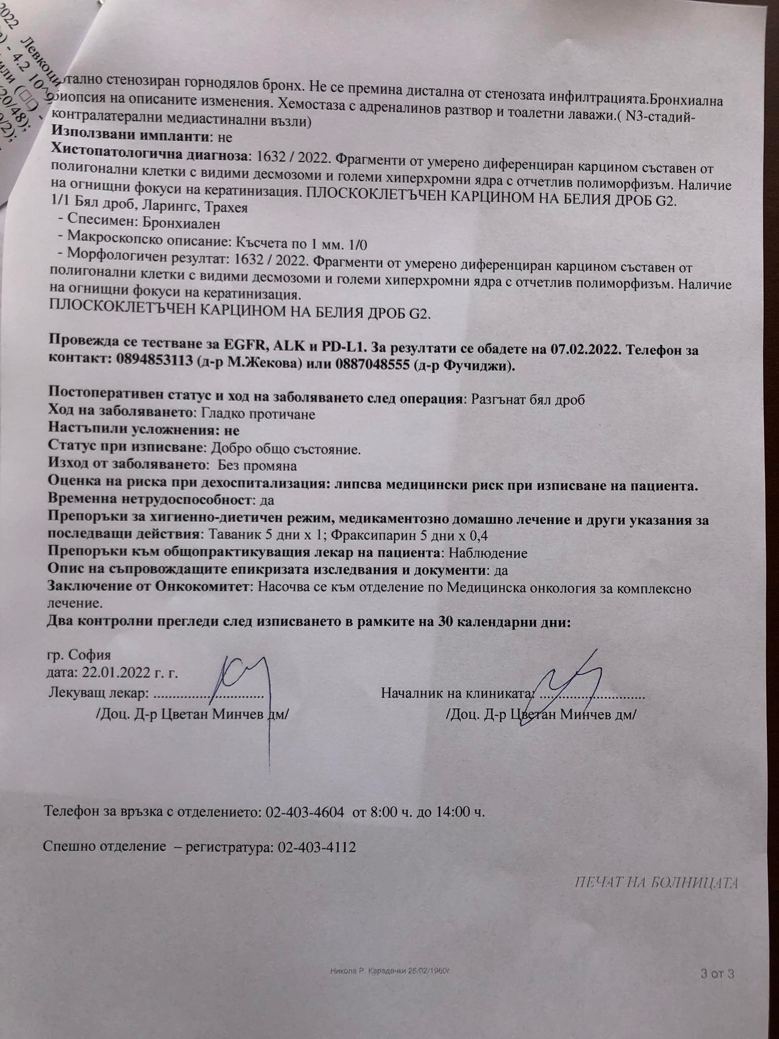 След появила се от нищото пневмония и неспираща кашлица с баща ми тръгнахме по лекари. Имаме 2 бронхоскопии в Токуда(първата неуспешна) и краен резултата плосколетъчен карцином. Взех и материал за второ мнение, но от Трансхеликс лаборатория след дълъг разговор и преглед на епикризита, казаха че шанса да има грешка е много малък и няма смисъл да правим допълнително изследване на материала. Запазила съм онлайн консултация с д-р Тимчева (благодарение на проченото тук). Естествено сме много притеснение, той има и тежък инсулт преди години, след него спря цигарите, сякаш ги беше забравил, но явно е било късно. В момента е и с ковид и не можем да започнем дори с прегледи от онколог или лъчетерапетв, това много ме тормози, защото нищо не правим в момента за състоянието му, затова ще бъда благодарна за всякакви мнение. .