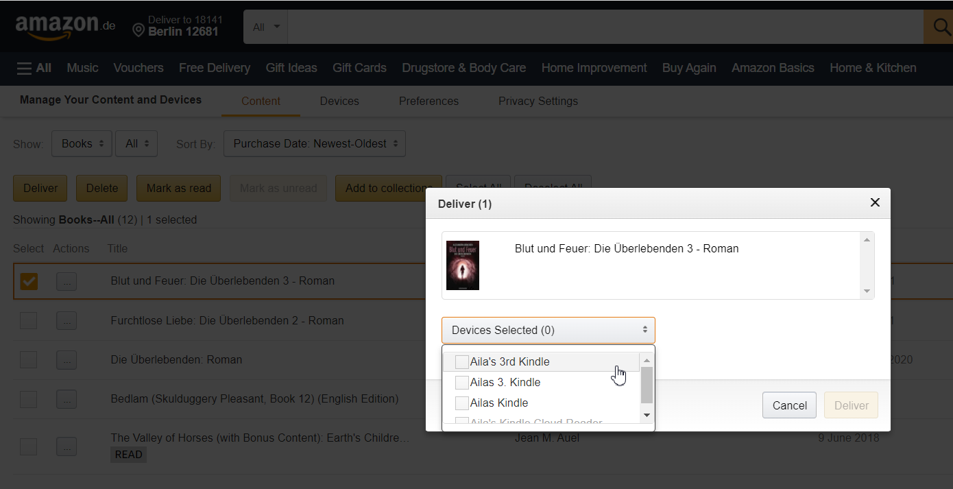 Когато купувам книга, по дифоут ми се сваля само на моят киндъл, най-вероятно отнякъде съм го настроила. На останалите киндъли изрично трябва от амазона да го пушна да се свали на даденият киндъл или от самият киндъл да си я отворя и даунлоудна. Но не се свалят автоматично на всички киндъли по дифоут. Така или иначе децата не пускат уайфая и няма и как да се свали книга на техните профили. Те четат предимно от читанка или си свалят от други сайтове, а когато изрично искам дадена книга да сваля от амазон аз им я свалям.