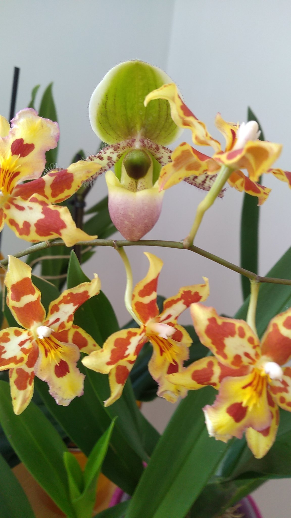 Този фаленопсис ми го подариха ноември. Гледам го на западен прозорец, топя го във вода като посивеят корените на около 10тина дни, в началото май по-често. Нищо друго не бях правила. 2 цвята паднаха, реших, че е нормално. Едното листо обаче започна да пожълтява и преди 3-4 дни го извадих от оригиналните кори, с които е купен - ами половината корени бяха изгнили. Изрязах ги и го сложих в нови (взех ги от орхидеи.бг). Но забравих да го накисна във фунгицид. Освен това имаше и от онези торфени цилиндърчета, което също не махнах (май трябваше, но изобщо не съобразих). Общо взето я бях отписала, но после видях пъпката на цветоноса. Въпросът ми е какво да правя и мога ли да я спася? Да я разрушкам ли отново, само няколко дни след пресаждане, за да я третирам с препарати и да махна онова степано парче пръст? Тази пъпка какво е? Бях се засилила да режа цветоноса, като падне и последния цвят, но това ме изненада.