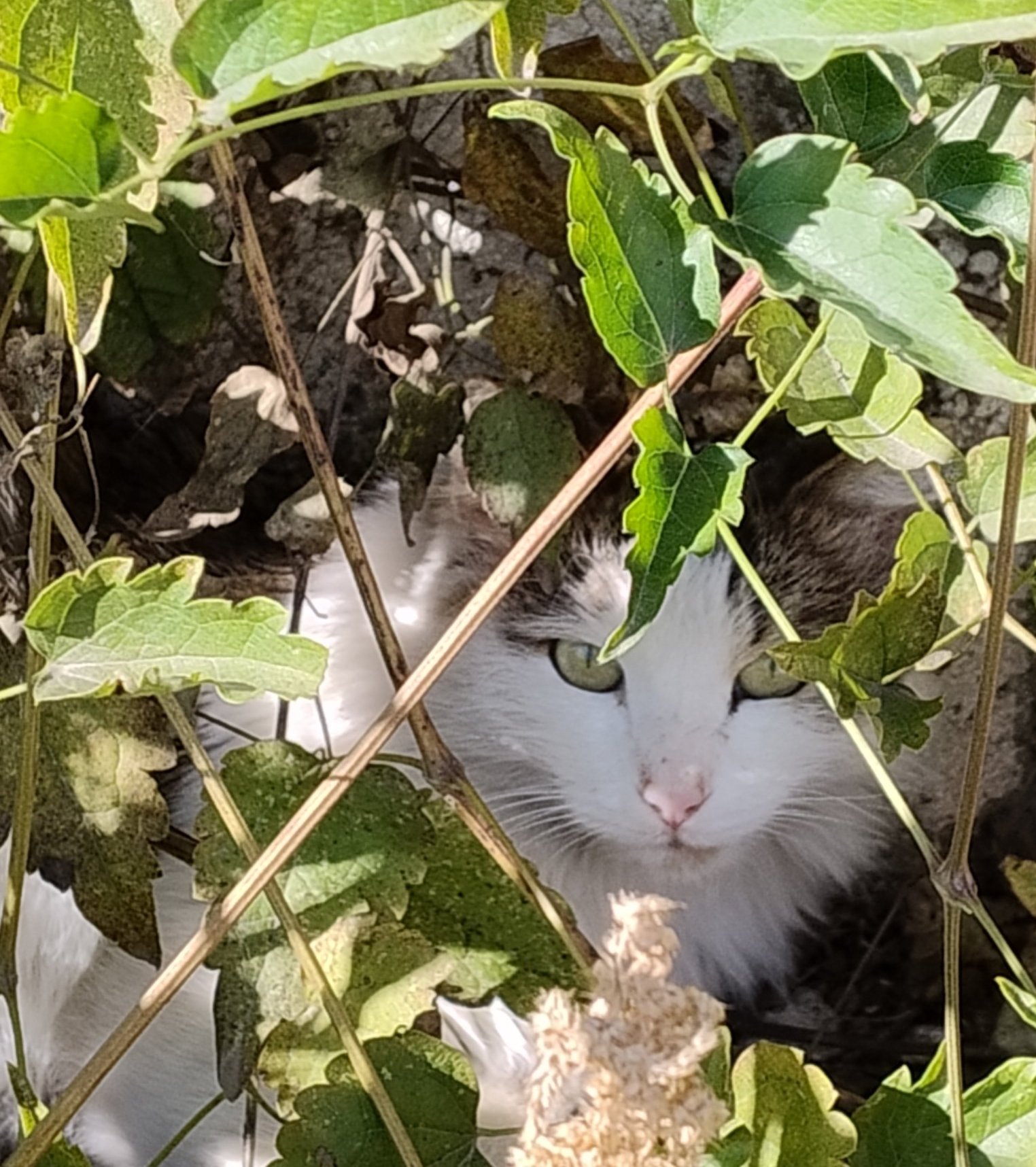 Балу е бил в семейство с къща, явно повече на двора. После те заминаха да си уреждат нещата и за него и другото коте трябвало да се грижат други хора. Това беше около 3 месеца. Колко е хранен, не знам. Ламя е, а е дебел. Сина не знае какво е да няма храна. Отстъпва, стои отстрани,гледа и чака. Ама ако не се намеся, ще си остане с чакането. Иначе е мирно, няма битки.