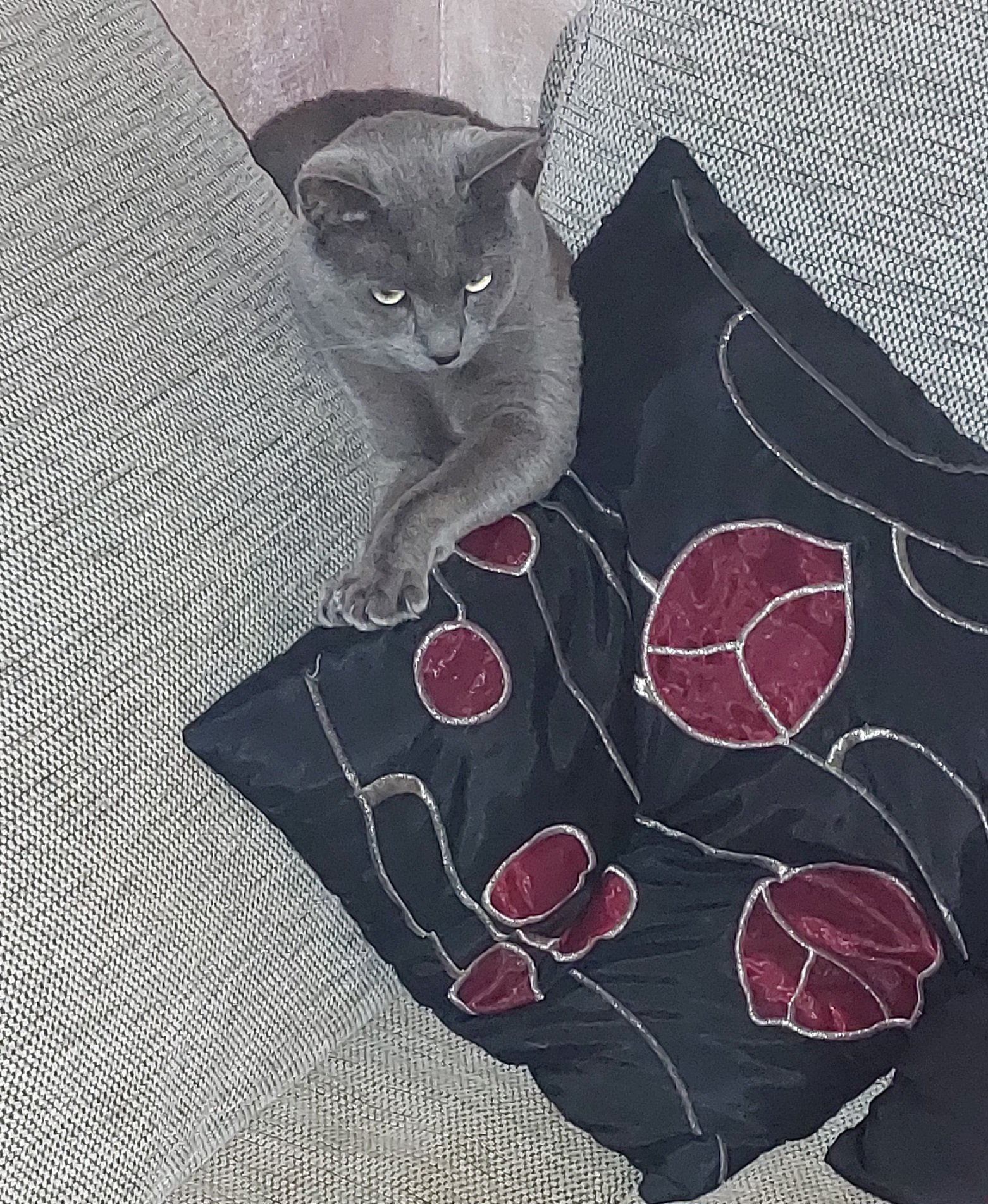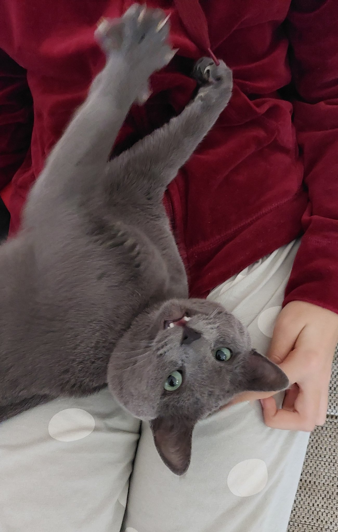 Породистият е Сина. Балу е...прилича на синя руска, но...някоя баба е кръшнала и не е съвсем чистопороден. Прибрахме го  от предишни собственици, които нито са го ваксинирали, нито имаше документи. Вече е обработен и чипосан. Предстои само кастрацията, през ноември. И тогава да очаквам ли още да надебелее?