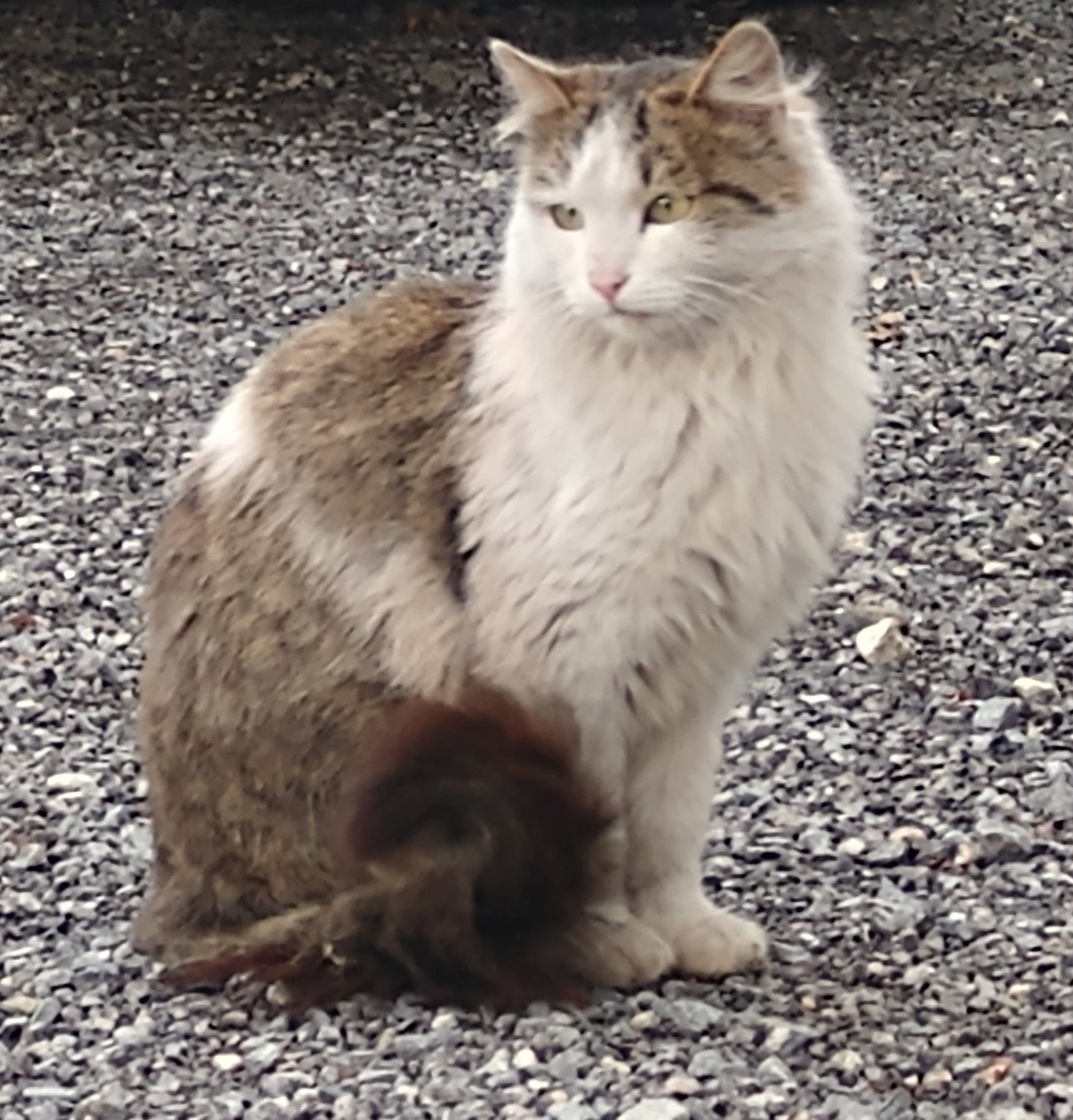 Поради липса на домашен любимец се включвам с тази улична красавица ( внушила съм си,че е женска),която храня до работата си, пети месец не дава да я погаля.  Но,отбрана котешка храна -  и всеки ден около 9 часа се е строила и чака.  Мърлява е като прасенце.