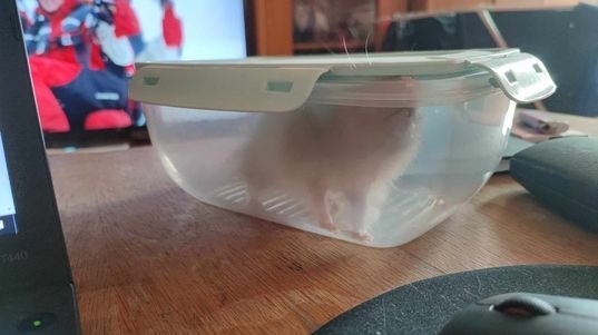 И да не е само спам, ето тук Бадем е в процес на основно почистване на клетката и аз го пазя, докато работя Wink