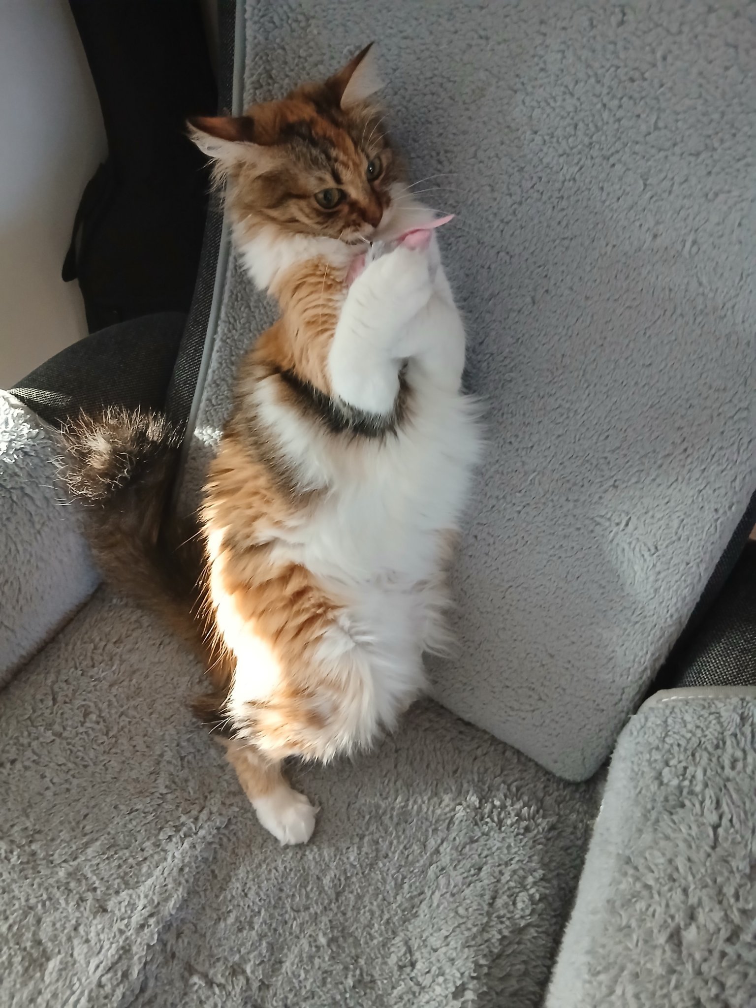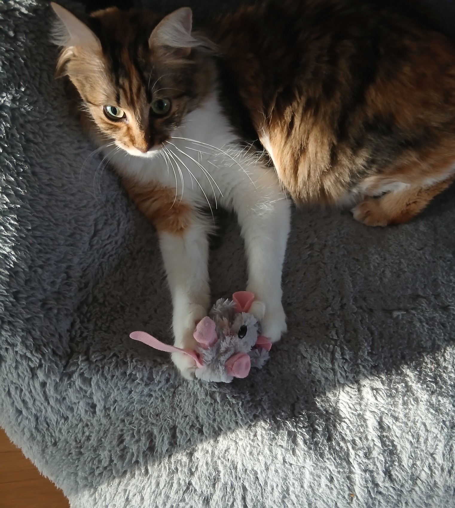 Мая всяка сутрин си чака играта.Точно като малко дете е,мяука,изправя се на два крака и ме побутва.Сутрин ,докато не съм си изпила кафето още,не ми е много до игра,но какво да я правя.Хвърлям топка или мишка и тя я хваща...