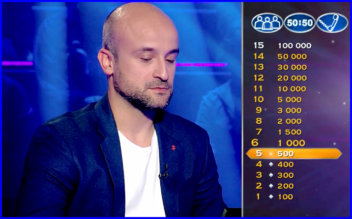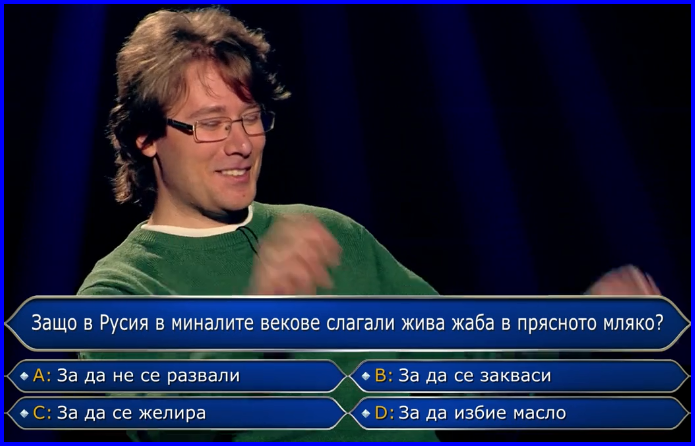Но ако имаше жокер 50:50 /който можеше да запази от предишния въпрос/, може би щеше да се справи. Много симпатичен играч, жалко!