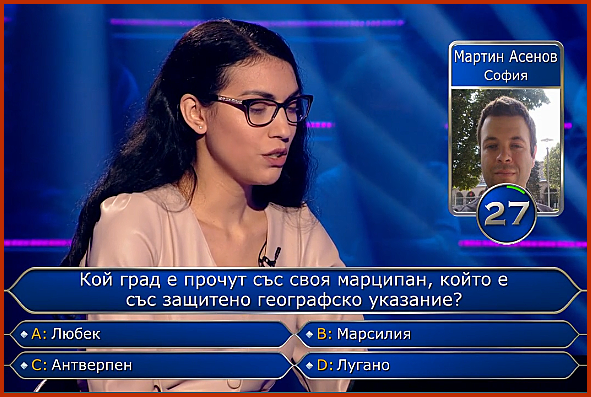Не разбрах защо използва жокер за златото, тя го знаеше! Много лесен въпрос за лъвовете за 2 хиляди лева...И накрая жокера я подхлъзна, но то се виждаше, че нещата по-добре да вървят към приключване Grinning