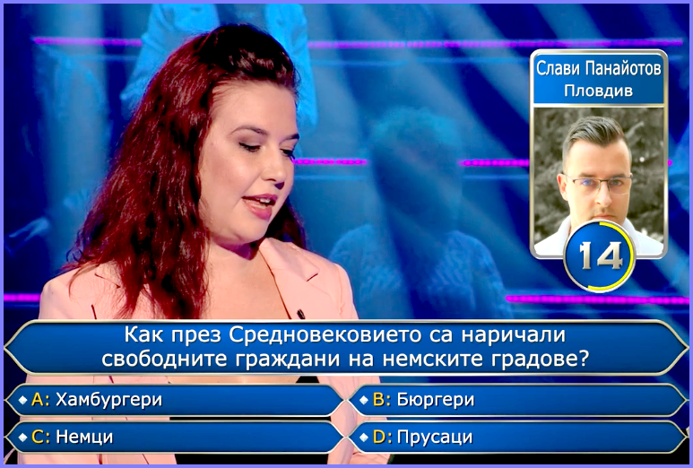 Този последния спокойно можеше да си има трите жокера заапазени.Много лесни въпроси,а той отпадна!!
