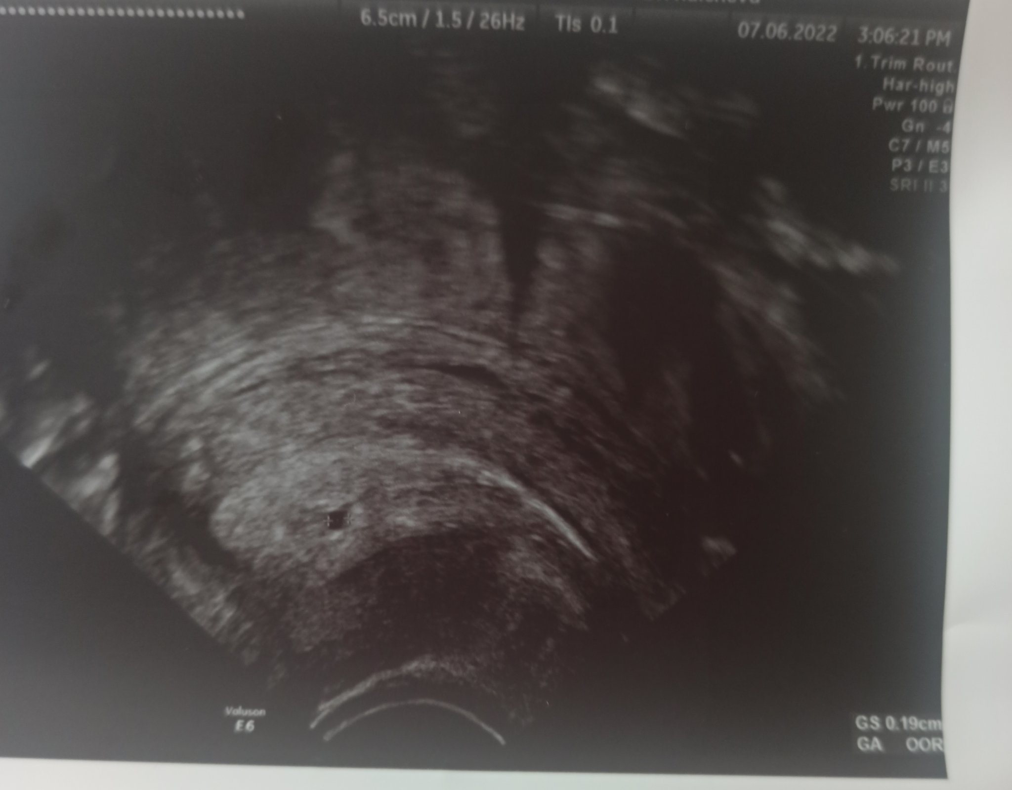 На 29.04. е датата на последната ми менструация. Овулация не съм следила, но общо взето ми идва на 28-30 дни. Правих няколко ,,пикливи” тестове, като всички от тях са положителни. Миналата седмица бях на лекар (знам, че е рано - той каза същото) не се видя нищо. Имам час за 13.06.