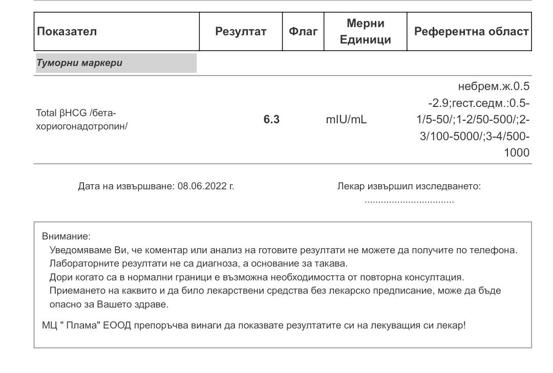 Някои лаборатории приемат резултат над 5 за положителен за бременност. При други от 5 до 25 е "неопределена зона".