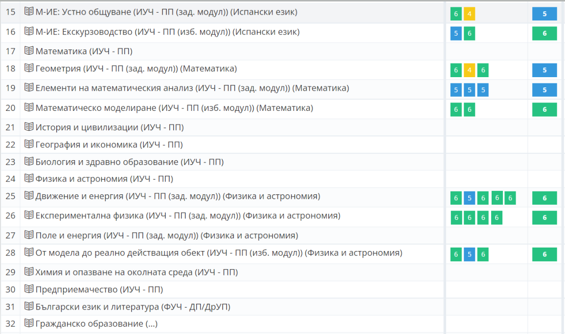 ето извадка от бележника, неговите ПП са физика и математика, но пък са изброени географии, истории и др: