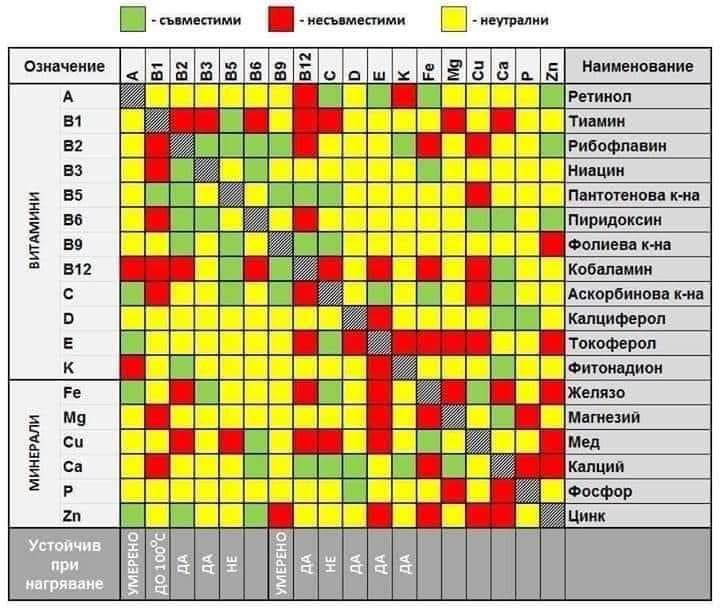 Ето една таблица за съвместимост между витамини и минерали, както и храни, богати на тях, ако все пак някой е решил да яде друго, освен хапове, спрейове и извлеци. 🤣