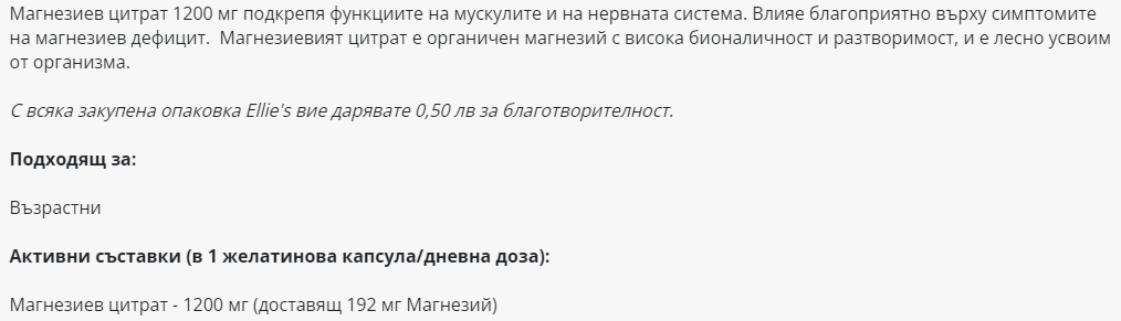 Това от линка на Азара не са 1200мг магнезий а 1200мг цитрат. Разликата е в пъти. Ето снимка от описанието на продукта, от същия линк. Чете се описанието винаги, че за добавки контролът го няма много-много как ще го изпишат на опаковката. Ако нямат описание дето да казва изрично колко магнезий доставя една таблетка/доза, мятам у лево и гледам следващото. Добавки бол,  а тия дето не си казват колко е, вероятно не е за казване.