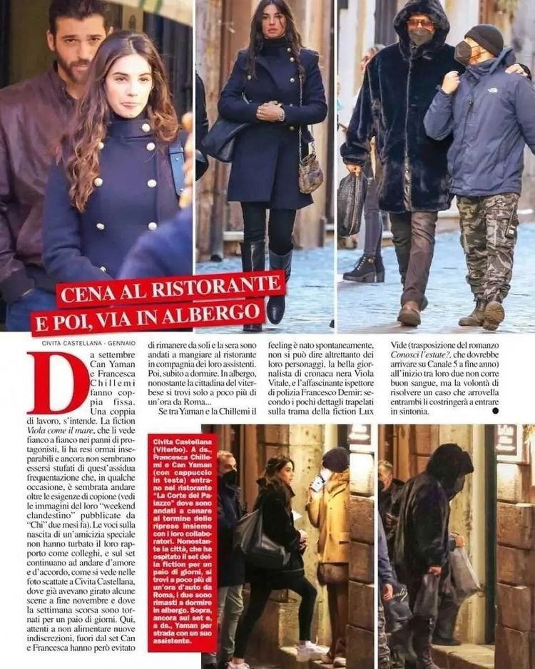 От септември Джан Яман и Франческа Килеми се превърнаха в стабилна двойка. Разбира се, работеща двойка. Игралният филм „Виола като морето“, в който те се изявяват като главни герои, ги направи неразделни и изглежда, че още не са се уморили от това старателно посещение, което на моменти сякаш надхвърля изискванията на сценария. Слуховете за началото на специално приятелство не нарушиха отношенията им като колеги и на снимачната площадка те продължават да се разбират помежду си, както се вижда на снимките, направени в Чивита Кастелана, където вече заснеха някои сцени в края ноември и където се върнаха за няколко дни миналата седмица. Тук, за да не се пускат нови слухове, извън снимачната площадка Джан и Франческа избягваха да са сами, а вечерта отидоха да хапнат в ресторант в компанията на своите помощници. След това веднага се прибраха в хотела,