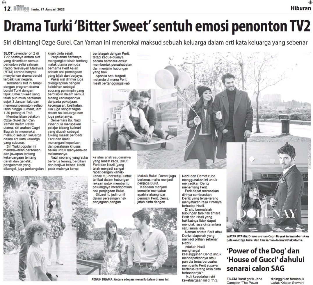 „Турската драма „Bittersweet“ докосва емоциите на зрителите на TV2. С участието на Йозге Гюрел и Джан Яман, тази поредица изследва значението на семейството в неговия истински смисъл.''