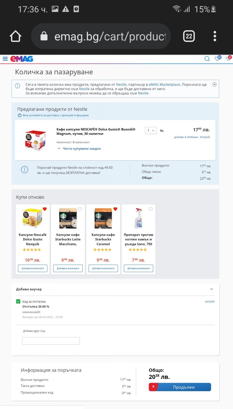 Код MKTPNestle20 за 20% отстъпка на продукти предлагани от нестле. Валиден до 6 март.