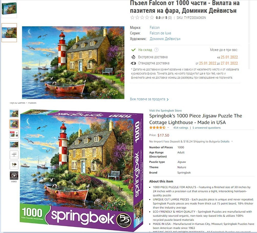 Давам, за никъде не бързам. Ей този пъзел искам, преди уж го имаше в Пъзел мания, ама не ми даде да го поръчам (или не разбрах как). Сега и там го няма. Търсих го днес в английския и в испанския Амазон - цъ.