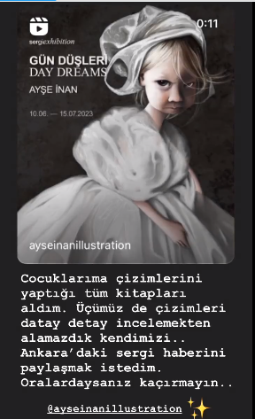 Купих всички книги, които тя илюстрира за деца. Трите успяхме да разгледаме рисунките в детайли. Исках да споделя новината за изложбата в Анкара. Ако сте там, не го пропускайте.