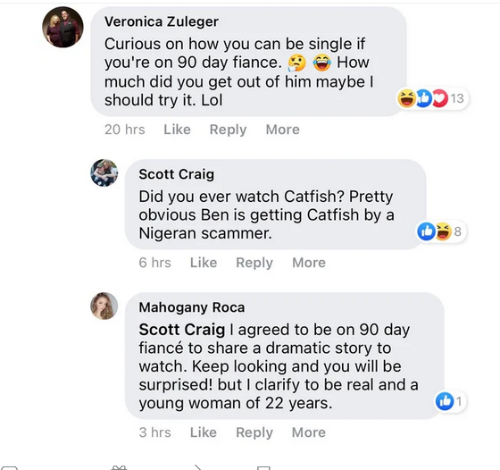 Пише:"Аз дадох съгласие да бъда в 90 дни до сватбата, за да споделя своята драматична история. Продължавай да гледаш и ще бъдеш изненадан! Но държа да изясня, че съм истинска млада жена на 22 години."