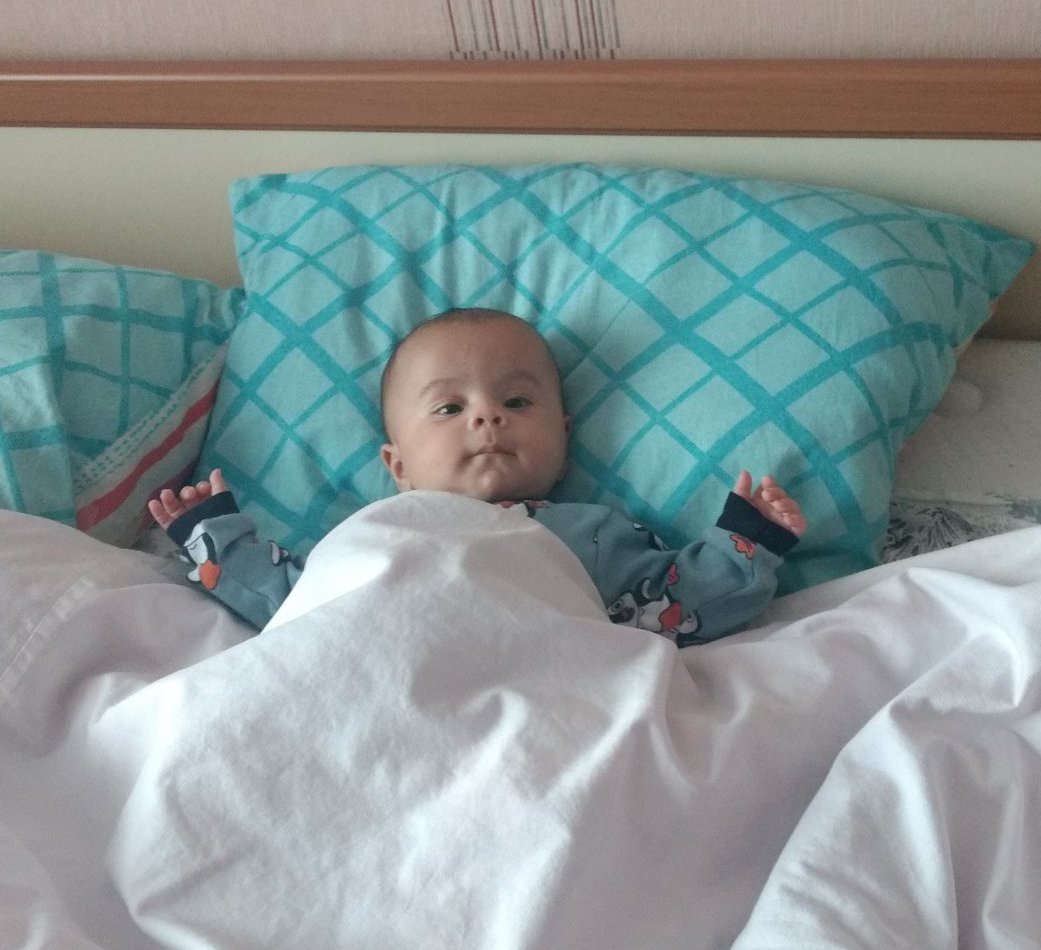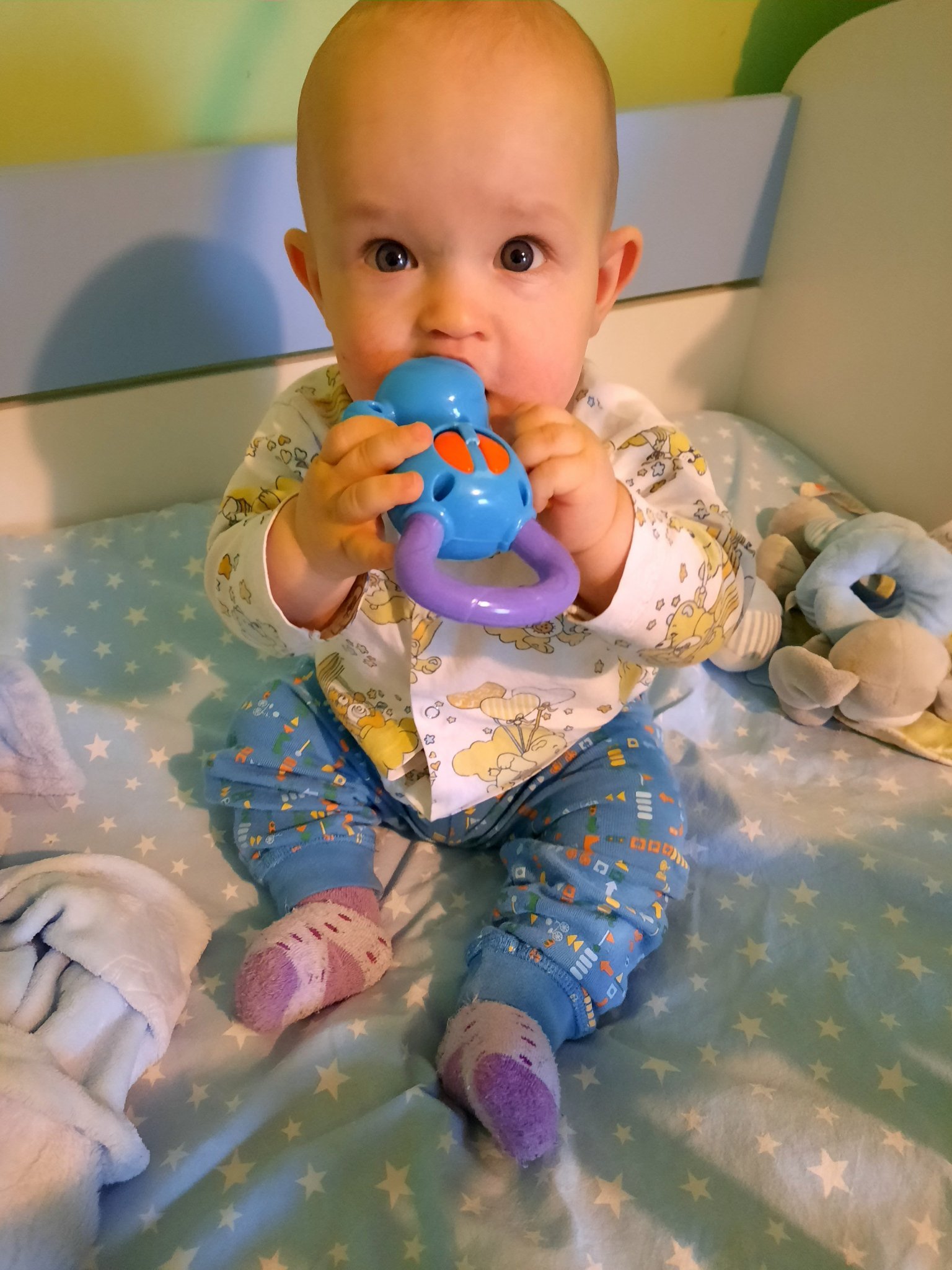 Видях красиви бебоци и бързам да покажа и моя. Вече стои стабилно седнал, прави опити да се изправя и да пълзи. Има и първо зъбче. Той също е много труден с млякото. Откакто опита пюрета и каши, хич не го иска. Върви дребничък засега- на 8 месеца е 67 см и 7800.