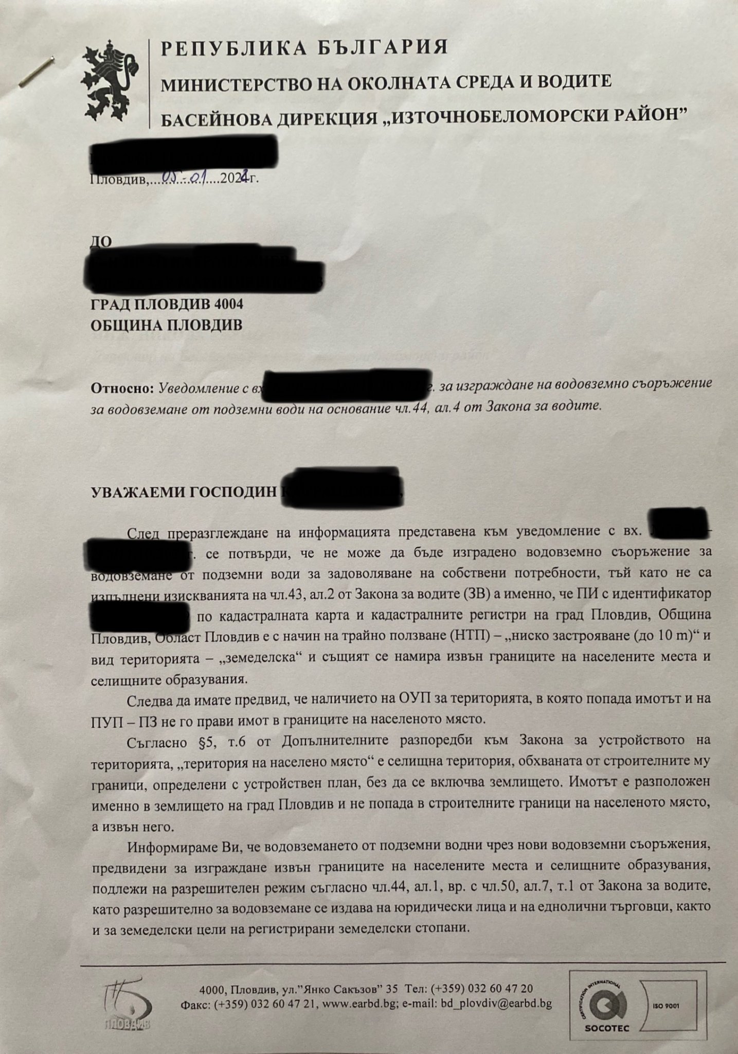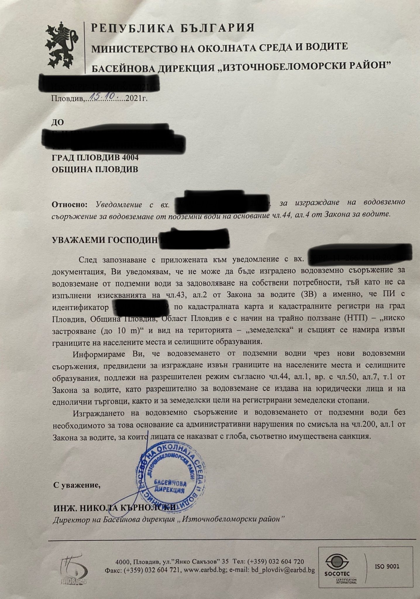 Относно Басейновата дирекция обърнете внимание с какви мотиви ви отказват. Може да сте в санитарно-охранителна зона, може в съседство да има попивни ями за отпадни води и не следва да черпите подпочвени води от там, защото е опасно за здравето ви. Вижте какво точно са ви препоръчали да се направи. Този отказ не е просто ей така, а вероятно имат сериозни мотиви.