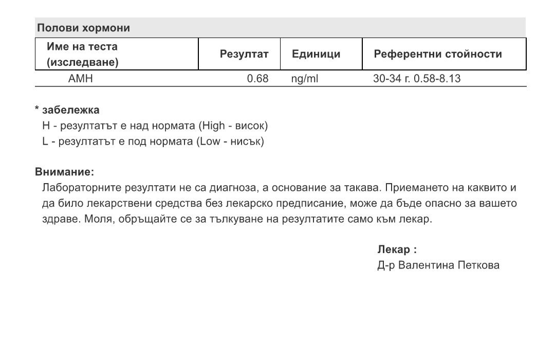 Здравейте, аз ходя при репродуктовен специалист, назначи ми изследване за АМХ, като излезнаха резултатите и аз се изплаших, че е много ниско, след това я питах и тя каза, че е добре, но аз естествени се съмнявах и си имах в мен някакво съмнение. На следващия преглед я попитах пак и тя каза, че по няколко неща се определя яйчниковия резерв, а не само от АМХ
