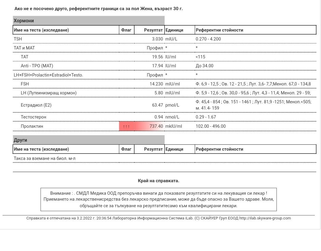 Сън, без да знам много, но имаш нужда от ендокринология или репро док. Тсх е висок, пролактина също, Амх е нисък за годините ти-пусни Вит Д задължително, сигурно имаш дефицит или пролактина го потиска.