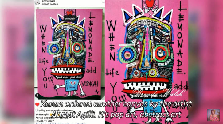 А Керем поръча още едно платно от художника Ахмет Агили. То е поп арт, абстрактно изкуство. На едното платно е написано: Когато живот ти е лимонада добави водка. Картината съдържа и фразата Мисли добре, бъди добър”. Предишното платно на Керем съдържаше мисълта Винаги обичам да живея с мечтите си”.