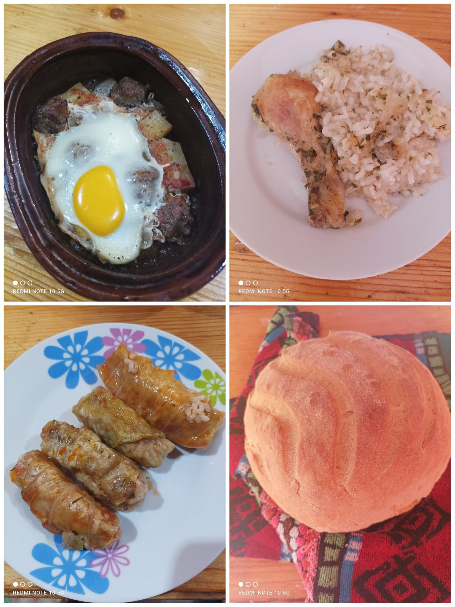 Гювечета с картоф, наденица, няколко изостанали гъби и яйце, пил.бутчета с ориз, зелеви сарми и домашен хляб